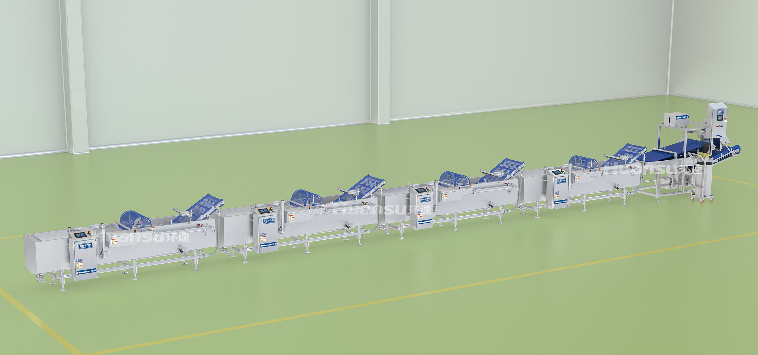 将水果批量投放至清洗槽,先利用曝气、涡流进行清洗,把毛发、虫子、泥沙等杂质分离出来,再利用毛辊、转笼、输送网带等装置分别去除,随后进行净水喷淋。清洗后的水果由自动分切机加工成果切,经输送带运往果蔬保鲜机进行保鲜。