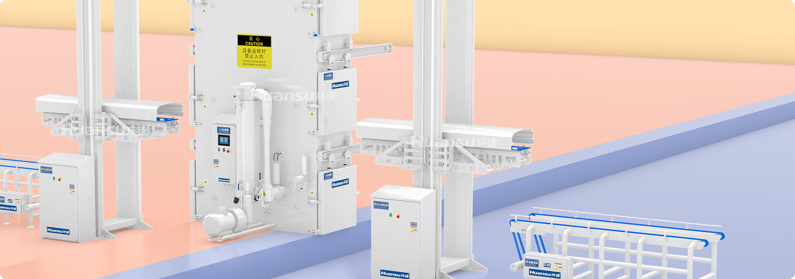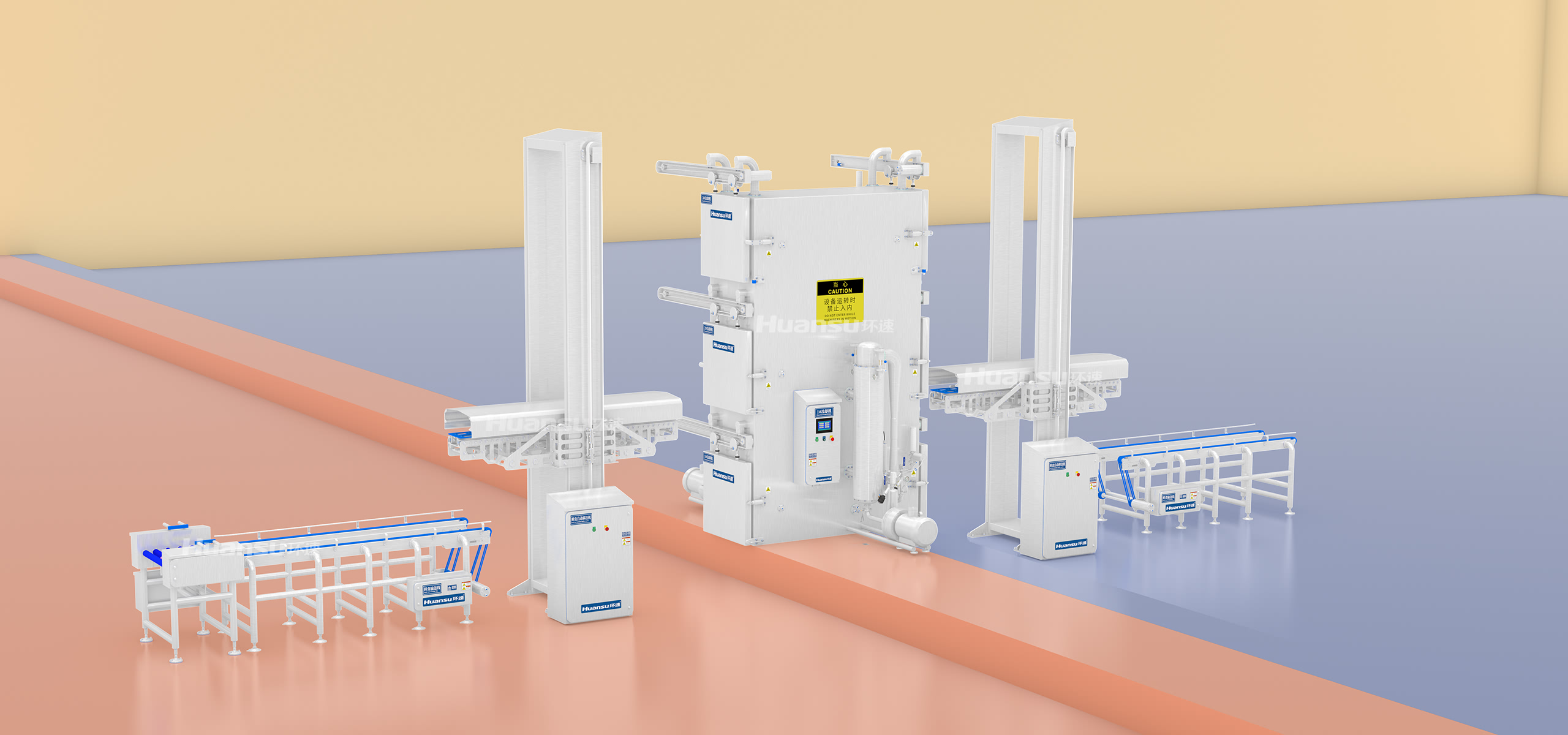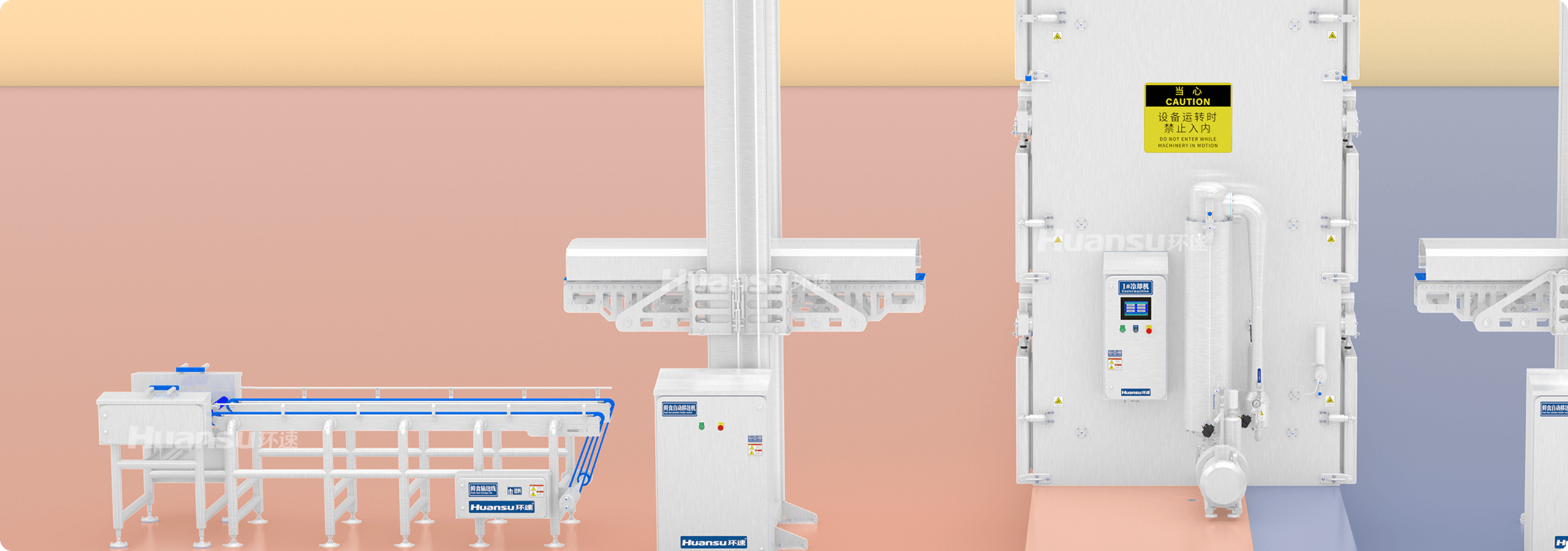 鲜食移送机沿轨道运行,负责食品的抓取与运转;刚出炉的烘焙食品被送入冷却机的舱室内,在真空环境中快速降温;冷却完成后,设备自动开启出料端的舱门,由鲜食移送机负责出料。