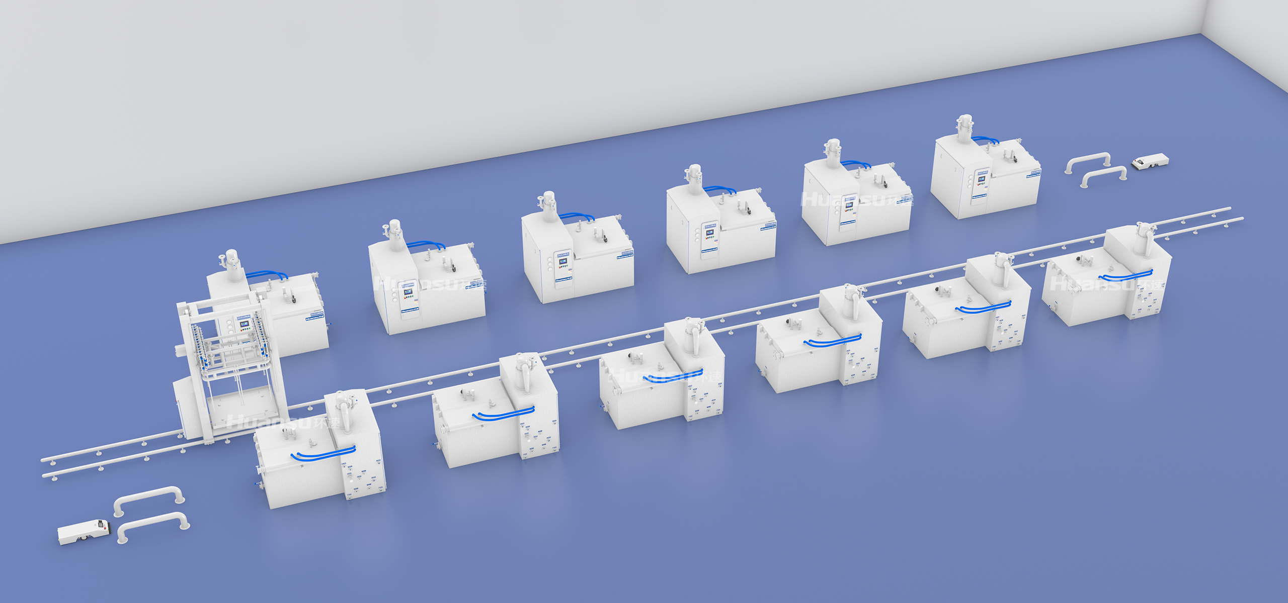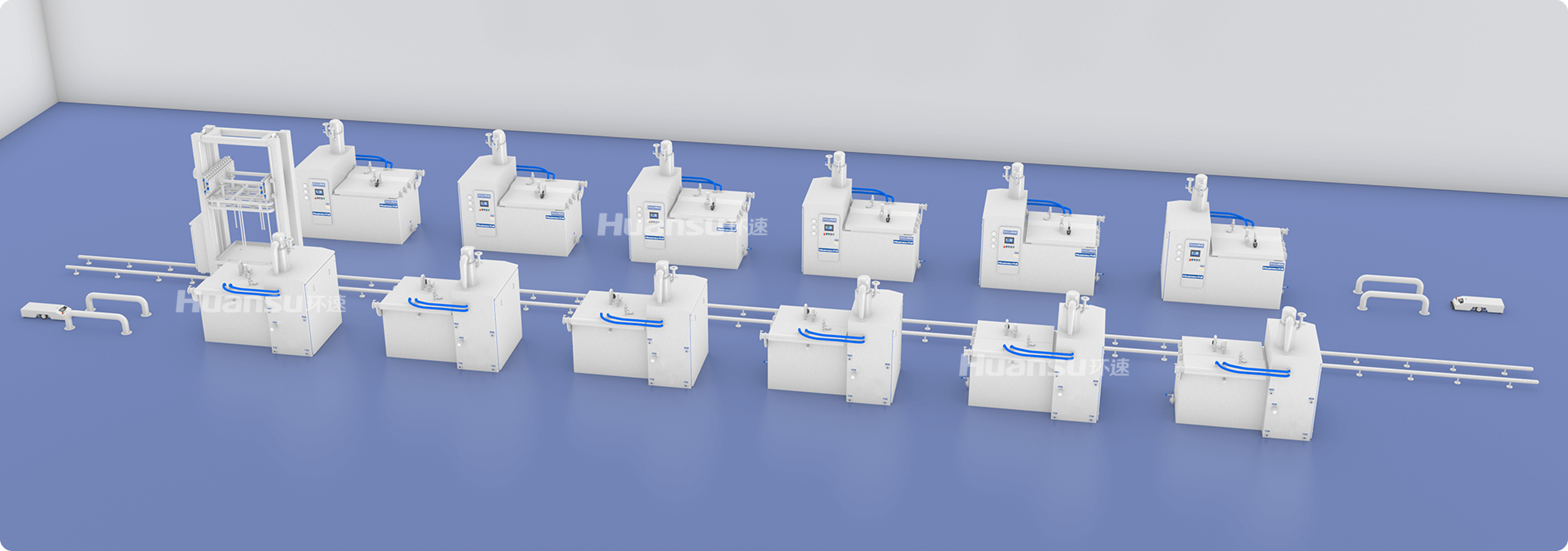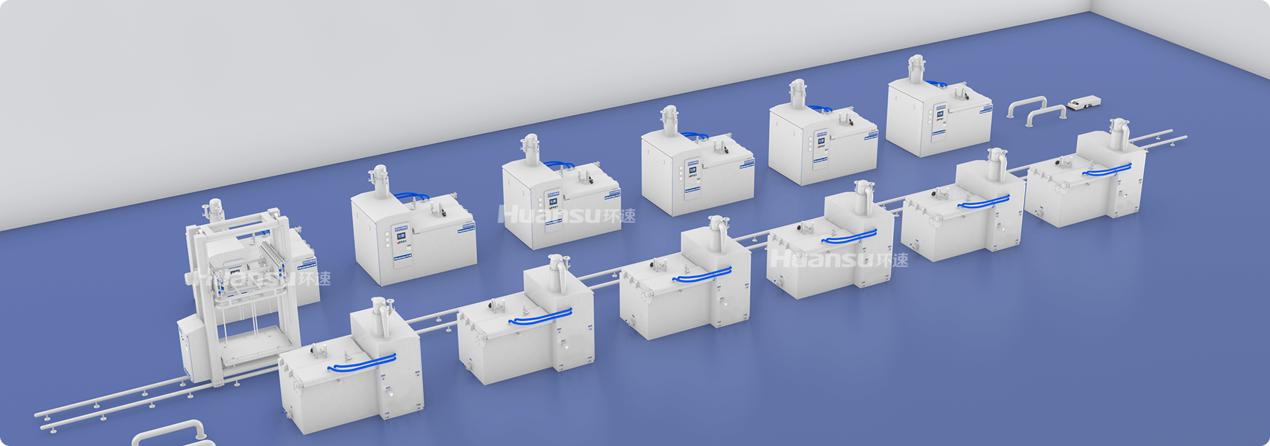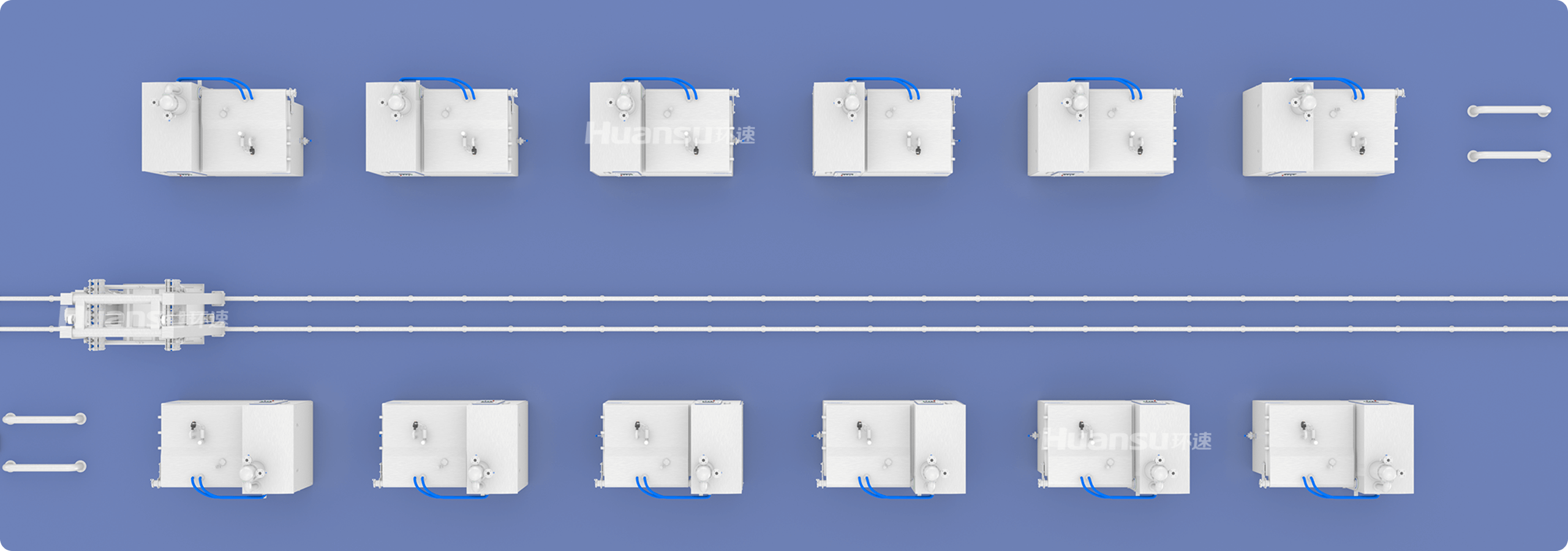 AGV小车负责运输容纳食材的料筐,智能抓取机器人负责将固定料筐的吊架整体投放到智能鲜食冷却机中,使食品在真空环境中快速降温。冷却完成后,设备自动开启舱门,由抓取机器人和AGV完成出料工序。