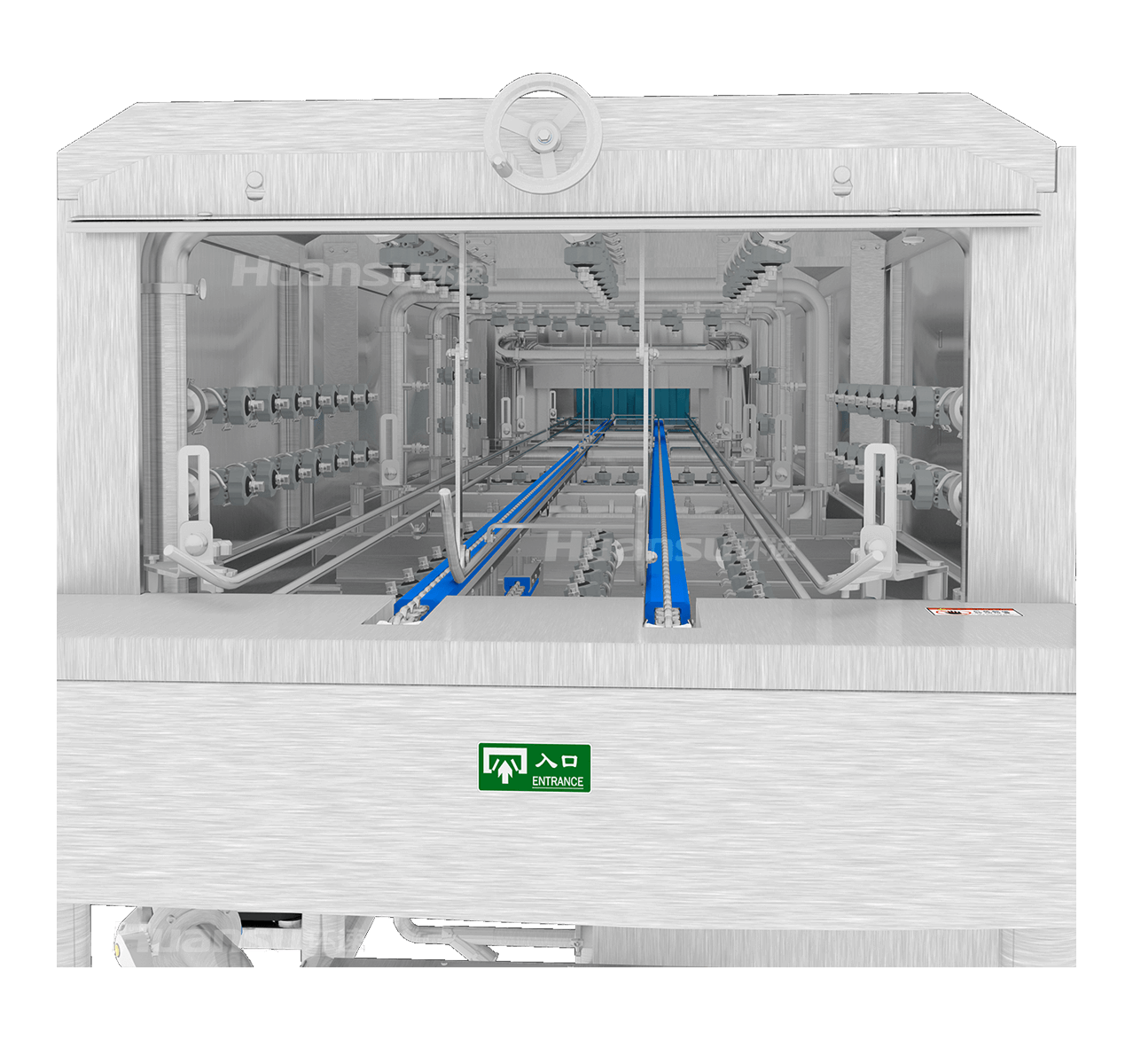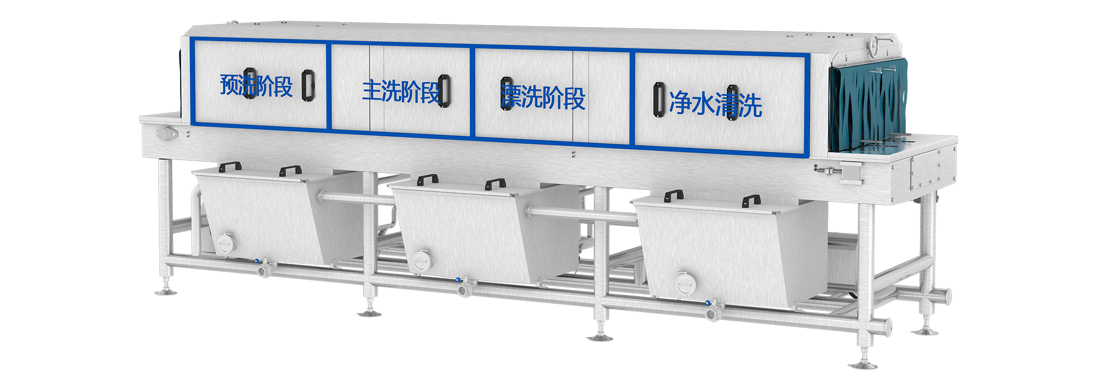 容器在隧道内随导轨行进,先后经历预洗、主洗、漂洗、净洗四个步骤。