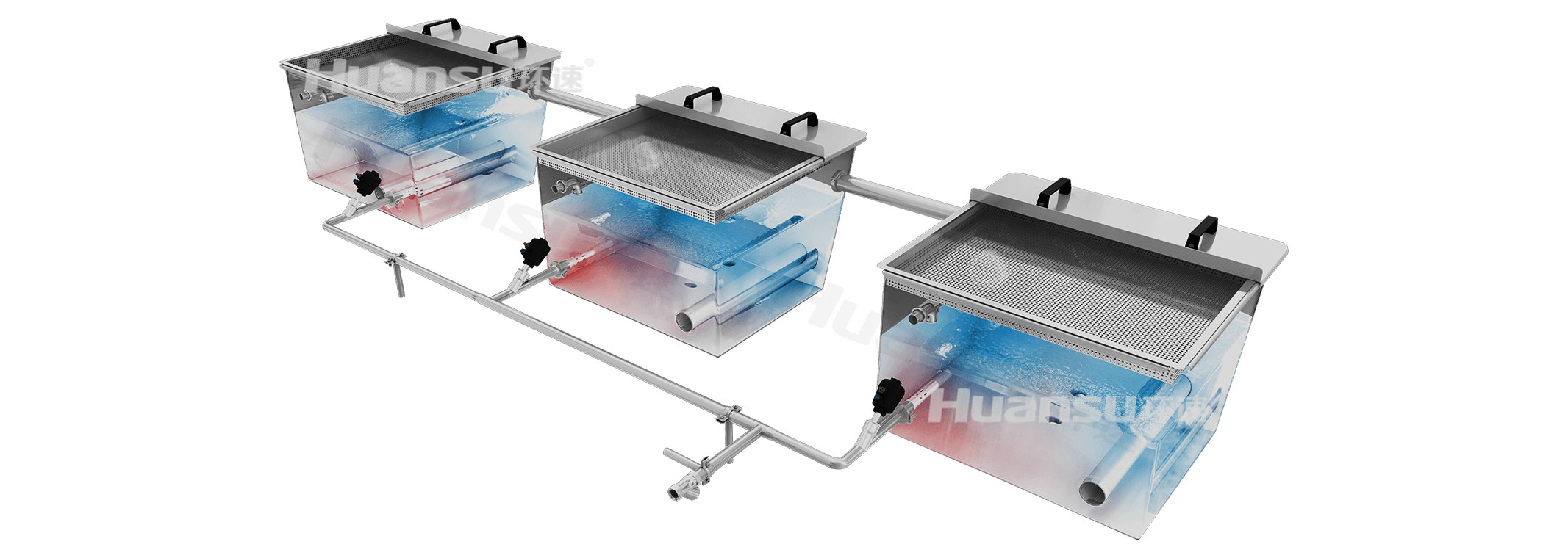 供水系统由三个水箱串联而成。各级水箱分别为不同的清洗步骤供水;使用后的水不会直接排放,而是重新回流到水箱中,先后经过两道过滤后重复利用。