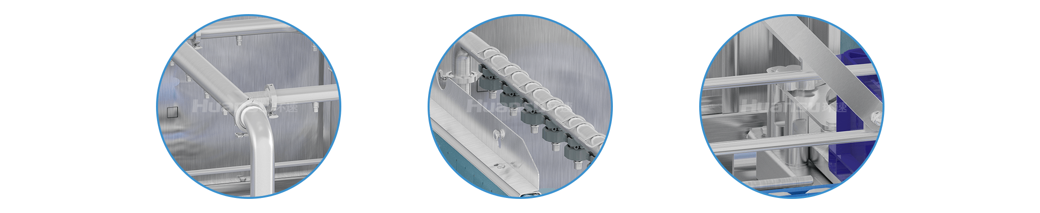 轨道链条配置有专用的清洁喷头,实时进行清洁,避免设备与容器发生交叉污染。