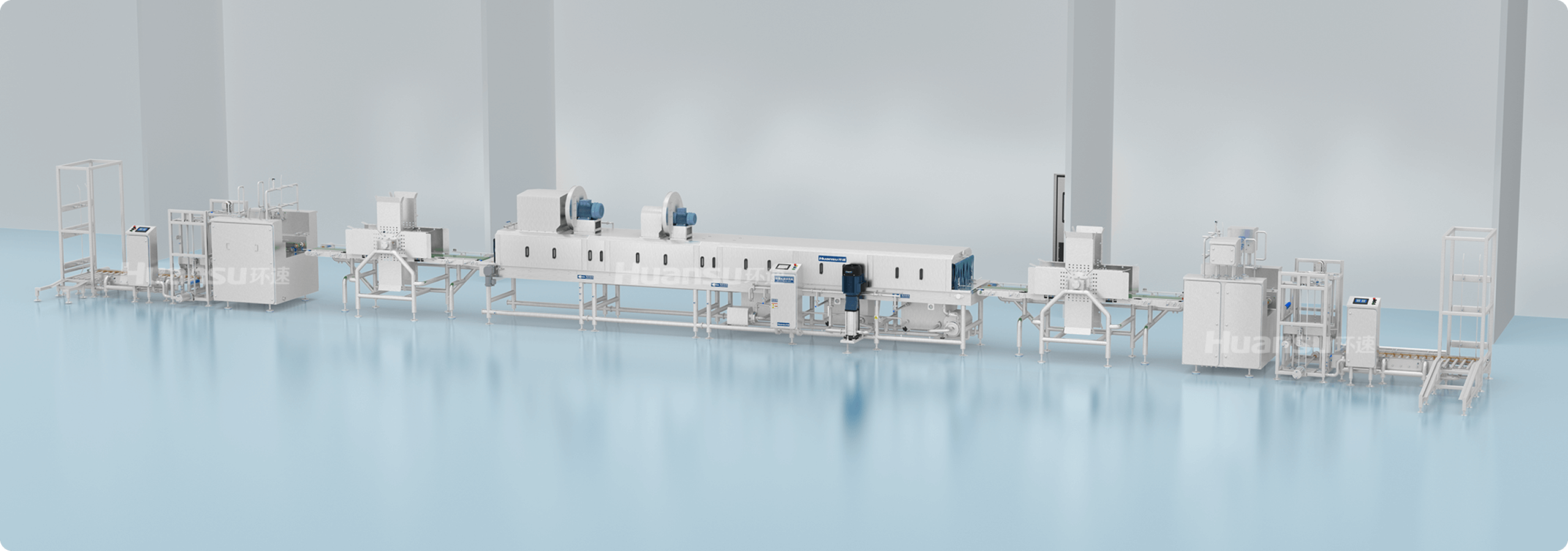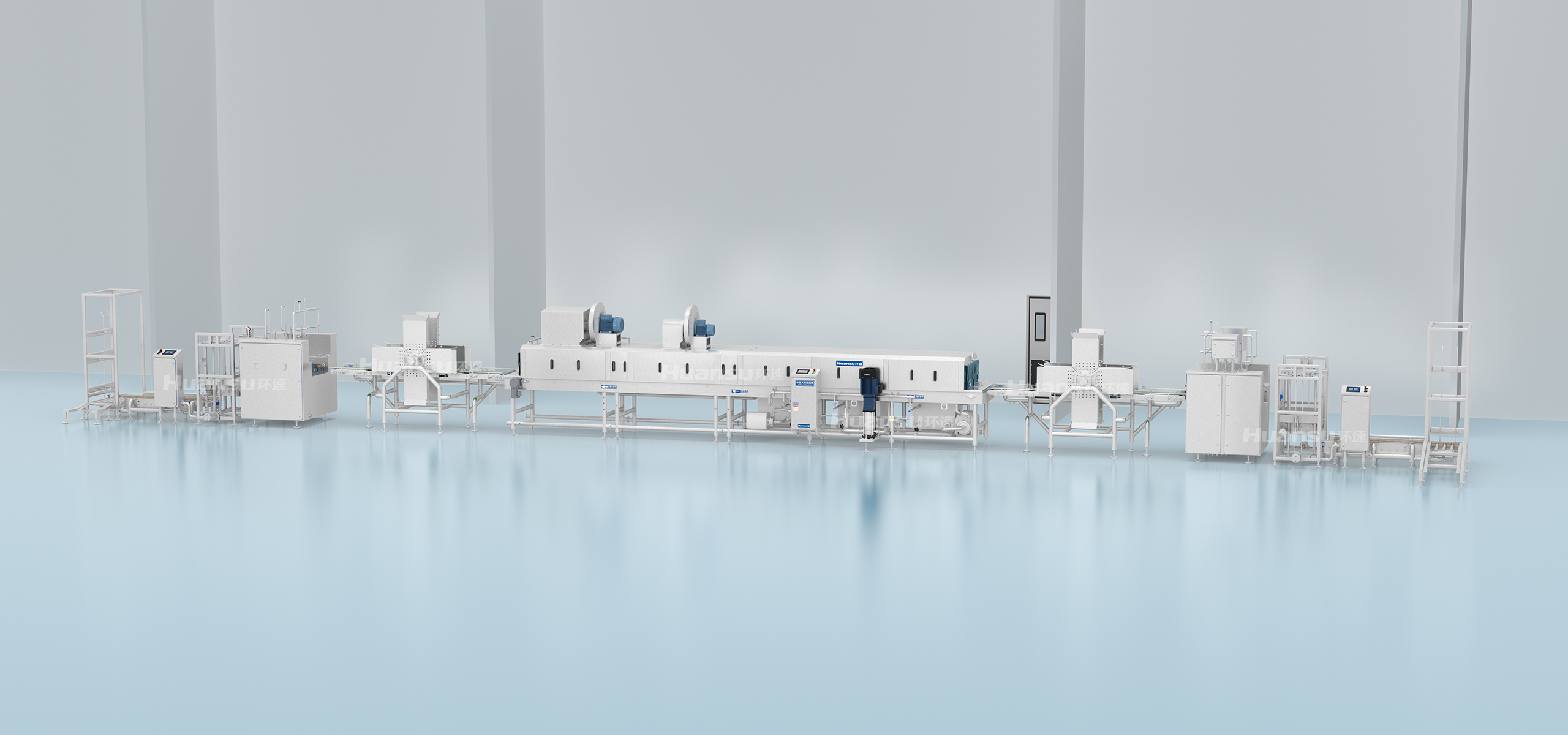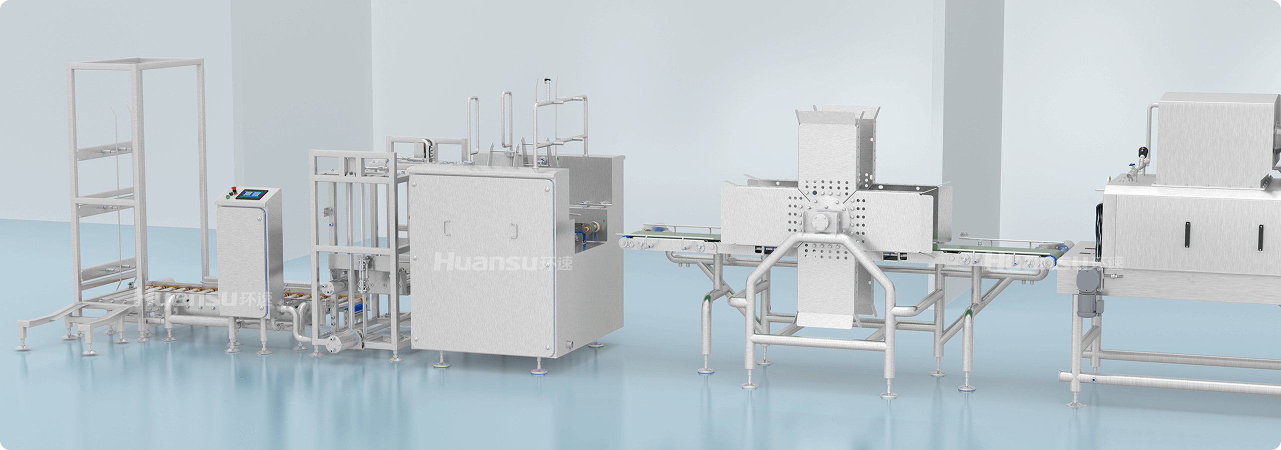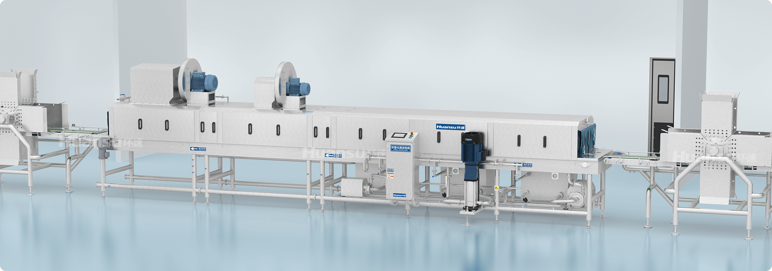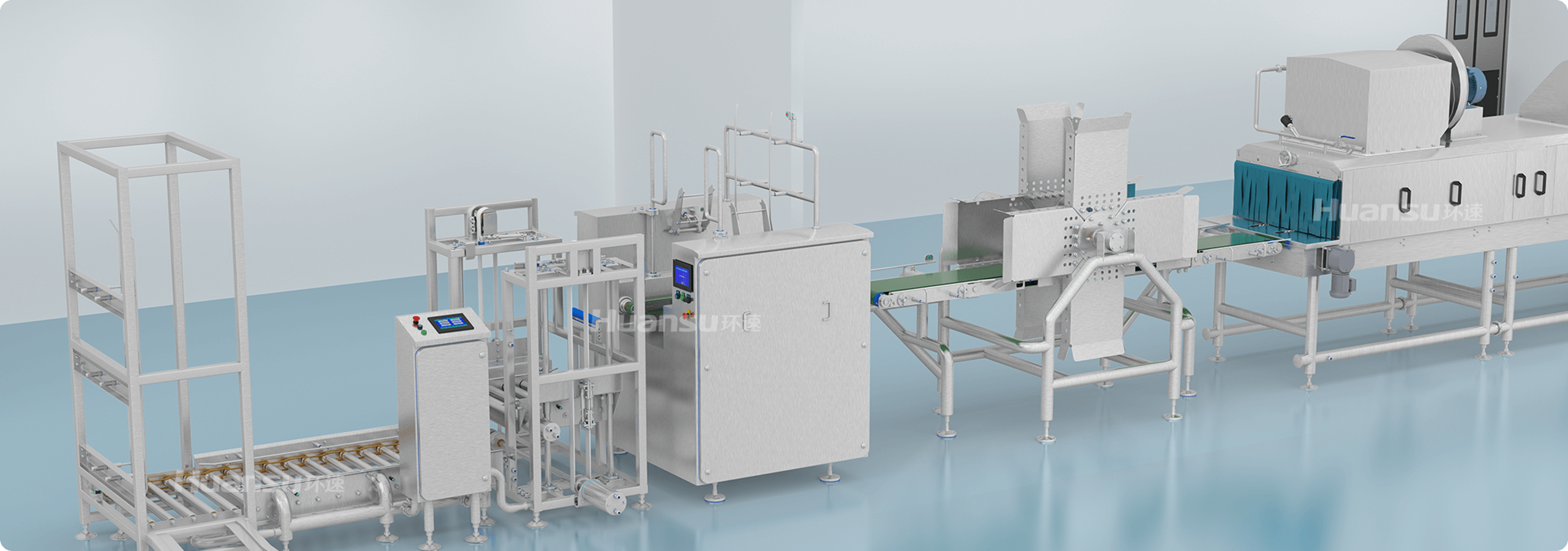 用于大批量周转容器(筐、盘、箱等)的全自动灭菌清洗。