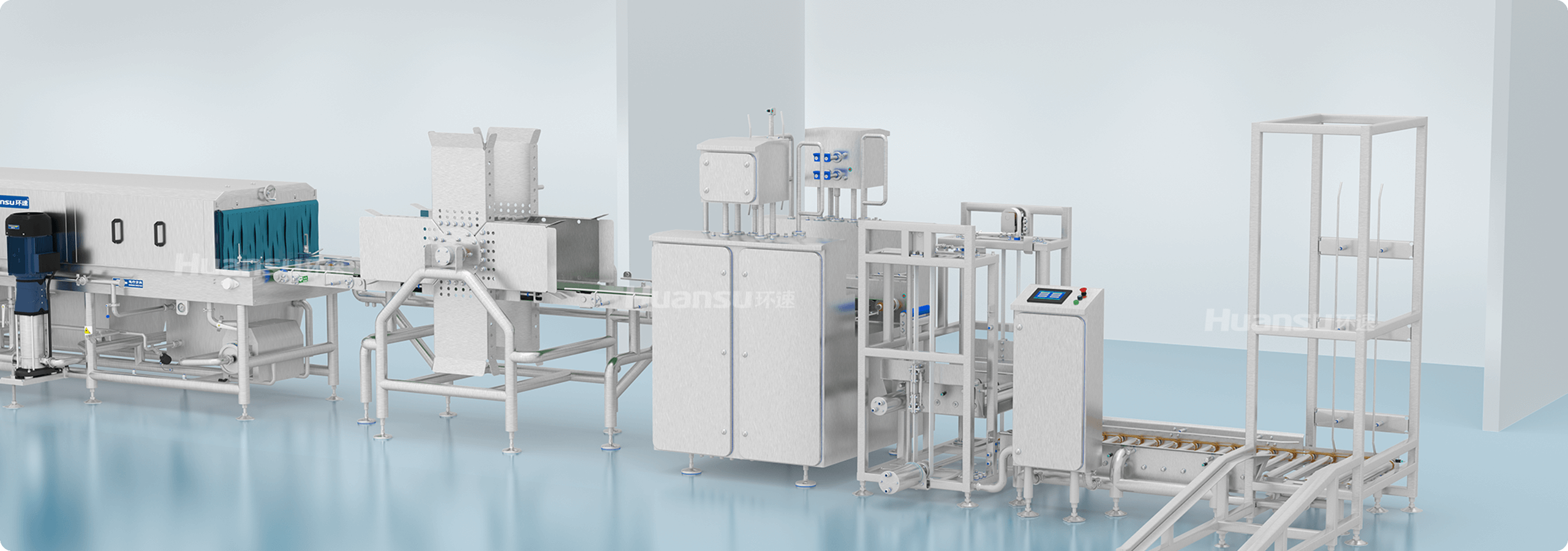 生产线具备多重卫生防护,严控污染隐患。全覆盖式喷淋清洗,灭菌不留死角;水箱设有过滤装置,确保循环用水的卫生;输送轨道配有专用的清洗喷头,避免与容器发生交叉污染。