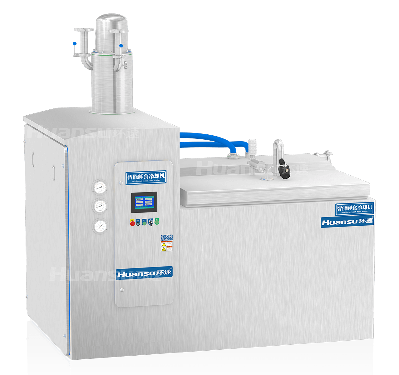热加工后的食品无法即时包装,需要等待降温后再作处理。如果采用自发降温的方式,食品将长时间暴露在空气中,从而面临表面氧化、滋生细菌等问题;传统冷却方式(风冷、水冷等),效率低、成本高,无法满足效率与卫生方面的要求。智能鲜食冷却机,冷却效率高,使食品快速度过危险温度带,抑制微生物的繁殖,延长食品保质期;采用顶开门式设计,方便与食材自动移送机等设备共同组建自动化生产线。