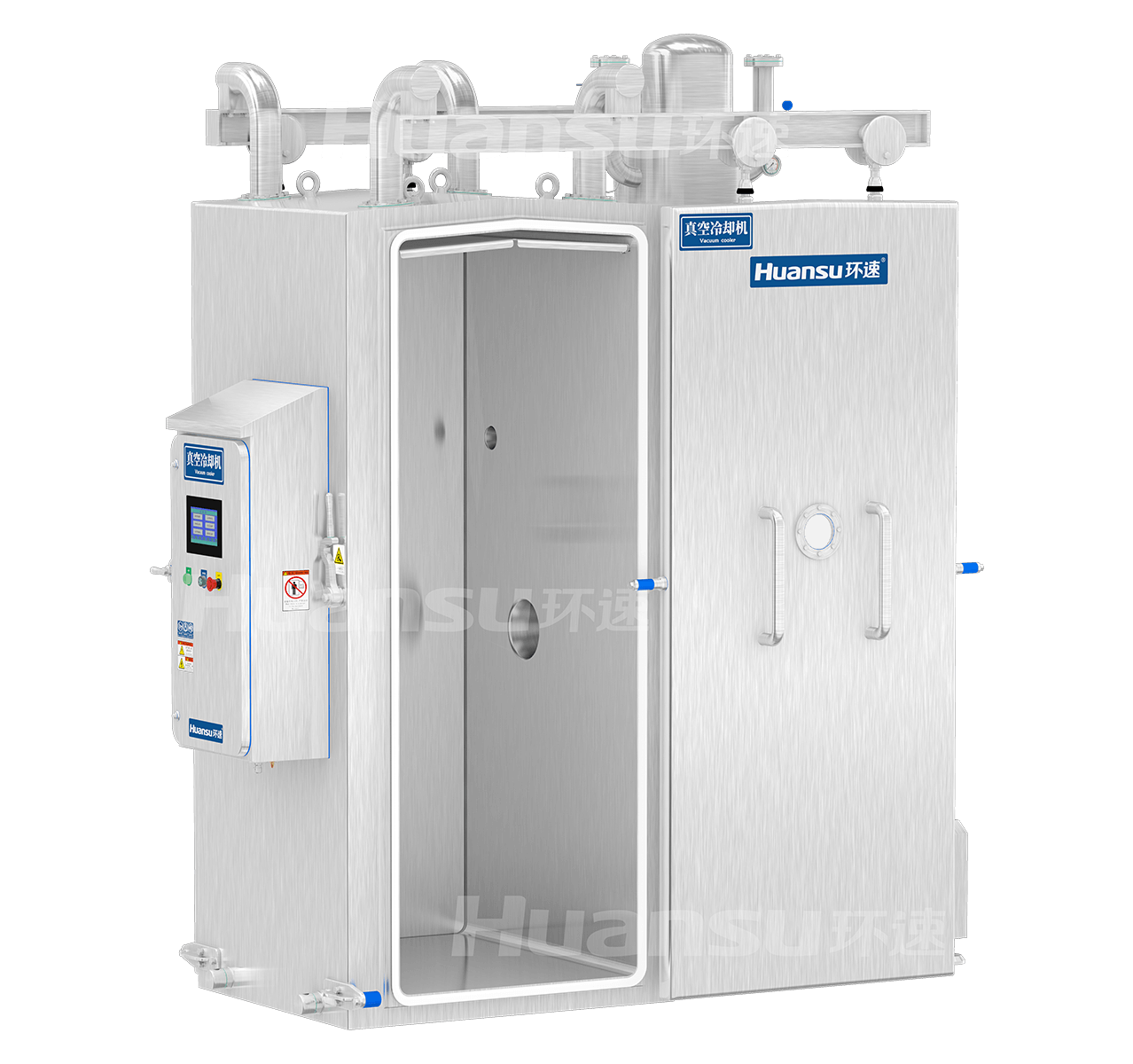 三级联合抽真空,快速降压,使食品中的水低温沸腾吸热,实现快速冷却。