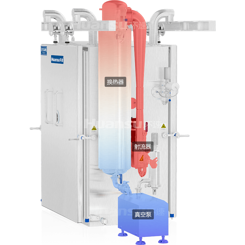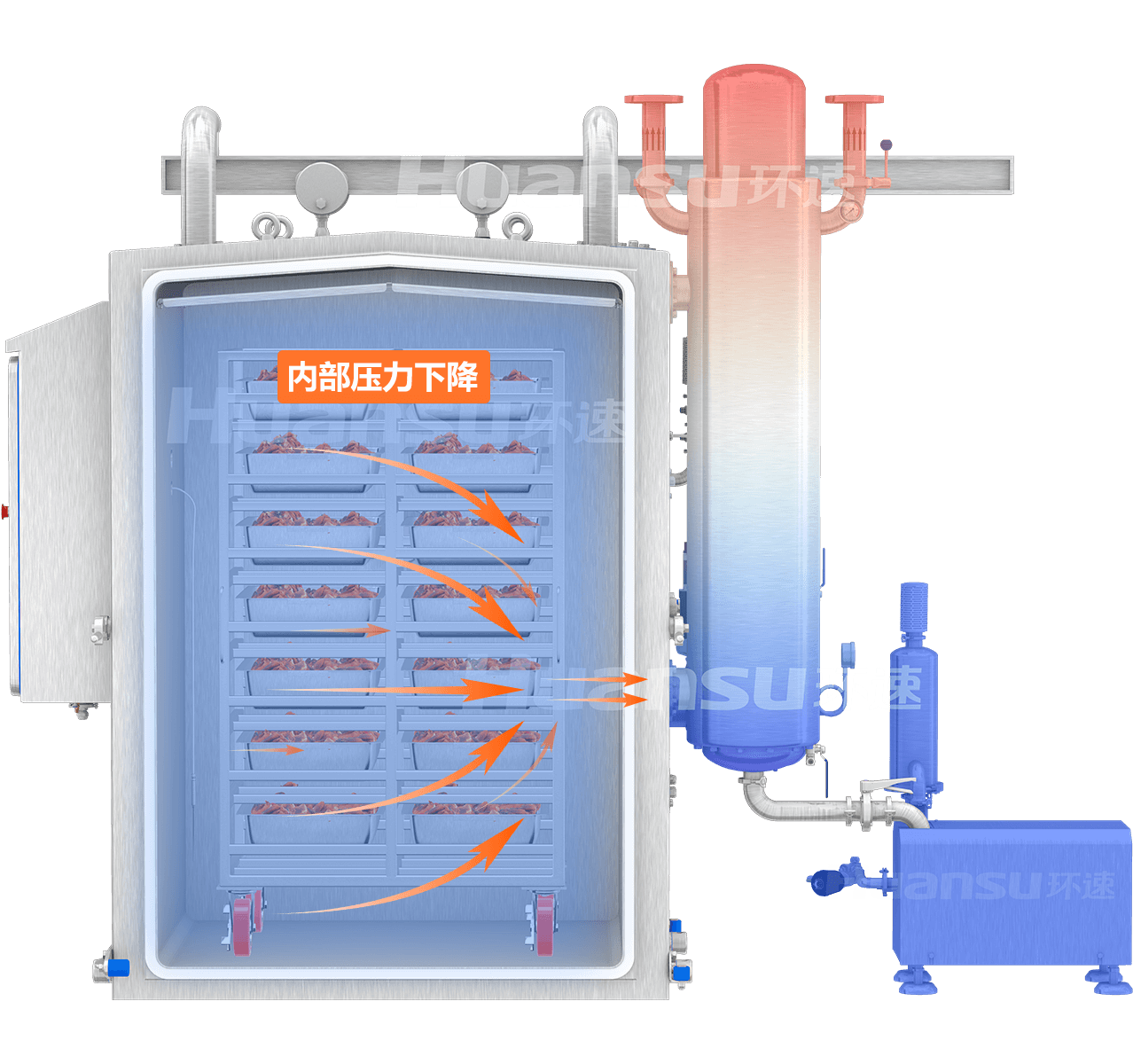 真空冷却机采用”三级联合抽真空“的技术方案,在密闭冷却舱中制造真空环境,促使食物中的水分在低温条件下沸腾吸热,使食品快速降温。