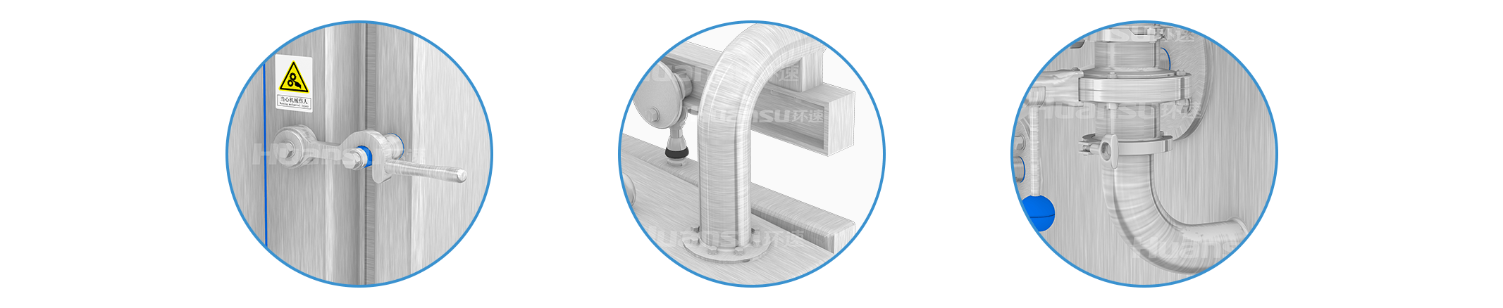 一体式无缝焊接内胆、圆管门体吊架、“工”字型滑轨等易清洗设计,杜绝清洗死角;过流管路可简易拆卸,确保清洗无障碍。
