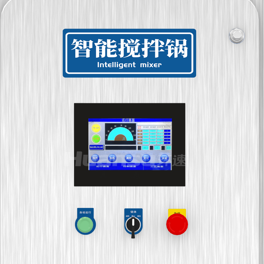 向内胆的夹层中通入高温蒸汽进行加热,温控系统通过调节蒸汽流量控制加热温度,搅拌系统按设定好的程序进行循环搅拌。加工完成后操作旋钮开关,实现一键自动倒料。