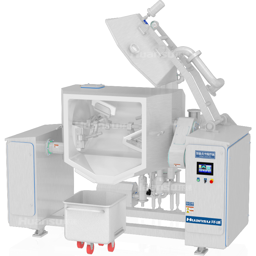 卧式圆柱形夹层内胆,容量大、加热面积大,单批次搅拌量可达800Kg。设备的真空度高,有效加快搅拌进程;一键自动倒料更便捷,缩短加工周期。